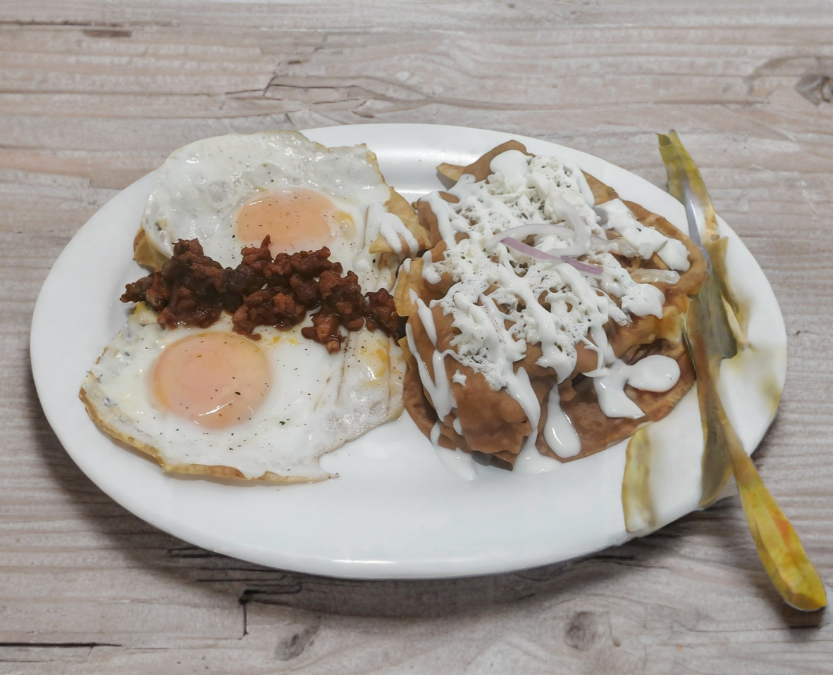 Clásicos totopos bañados en salsa verde decorados con crema, queso panela y cebolla morada con 2 huevos estrellados acompañad
