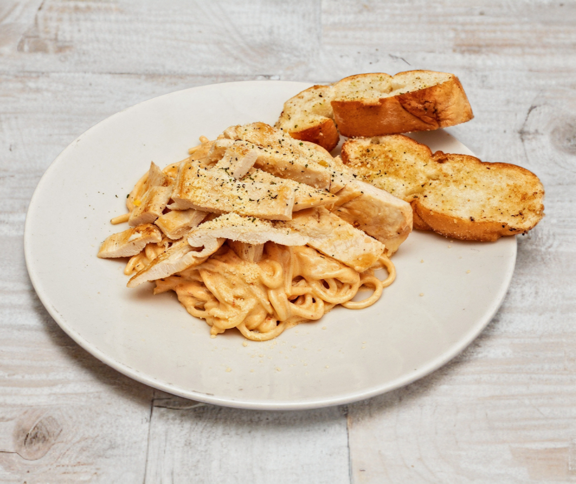 pechuga empanizada rellena de jamón y queso asadero, acompañado de pasta al poblano, puré de papa y pan de ajo.