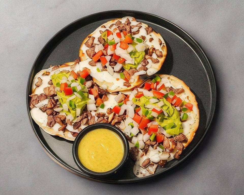 Tostadas de maíz con guacamole, arrachera, queso suizo y pico de gallo