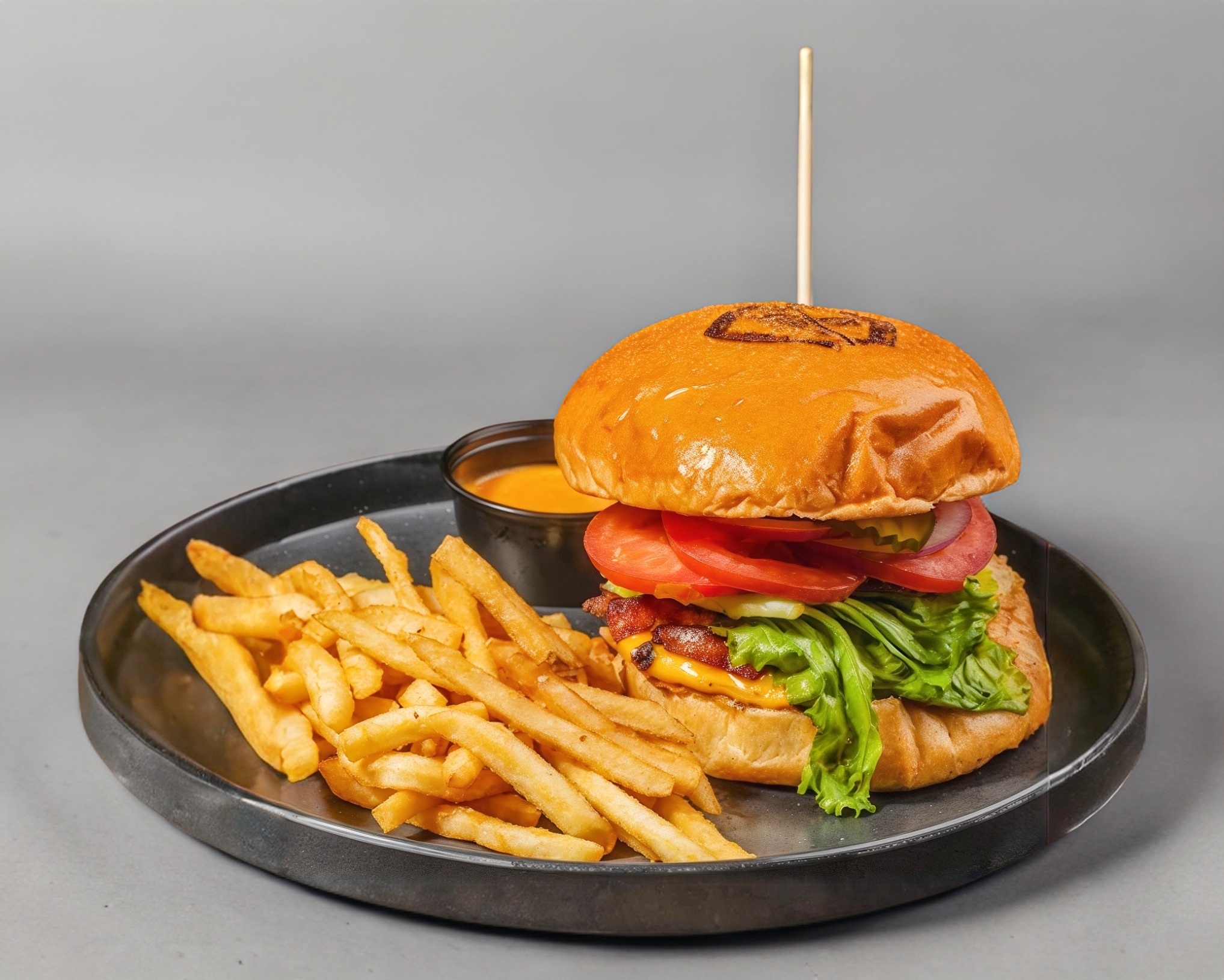 Pan brioche, queso americano, salsa de queso, aderezo de la casa, doble carne de res, lechuga romana, tomate, cebolla morada, pepinillos y aderezo. (NO INCLUYE PAPAS)