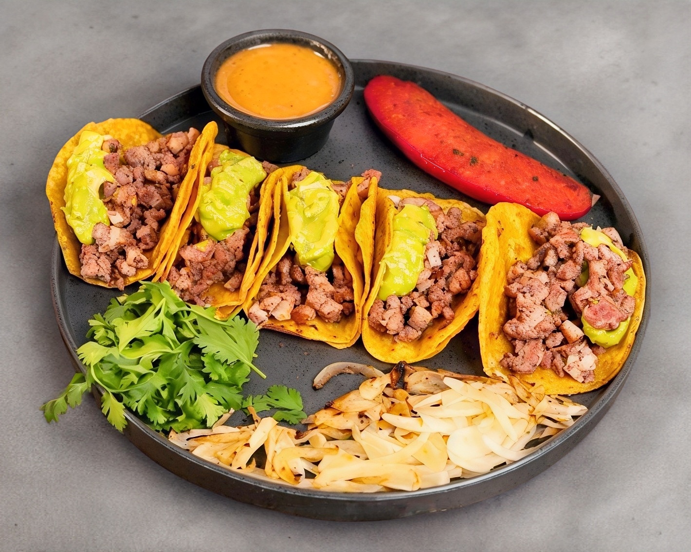 5 tacos de arrachera acompañados de guacamole, salchicha, cilantro y cebolla asada.