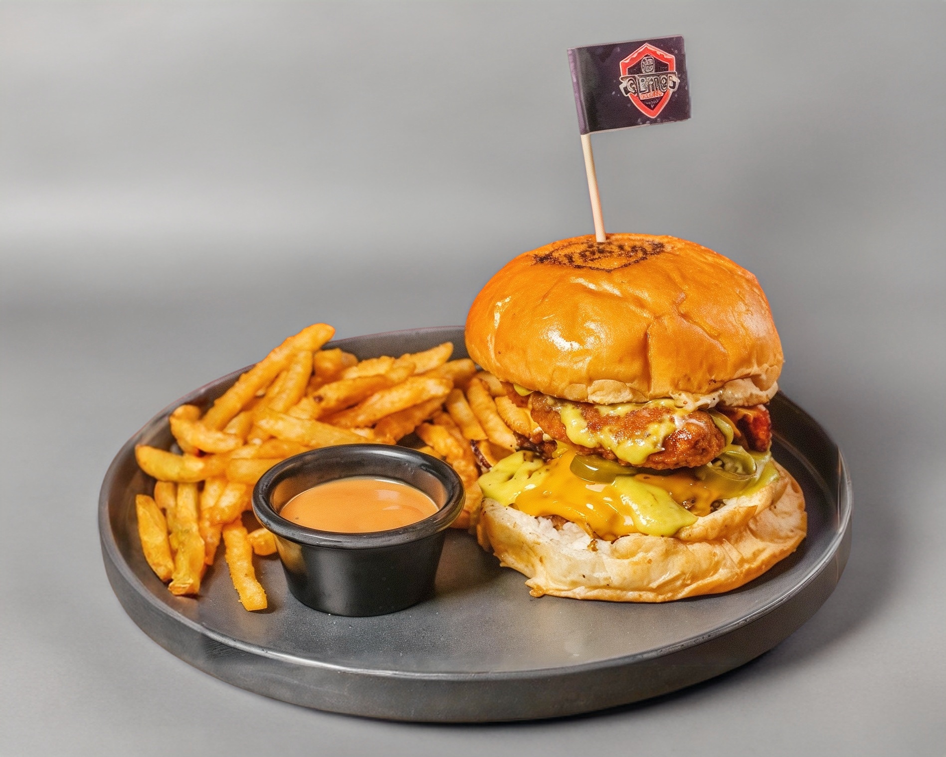 Pan brioche, carne de hamburguesa, queso americano, aderezo de Burguer, aderezo jalapeño, tocino, jalapeño poppers, chiles jalapeño y aderezo buff ranch. (NO INCLUYE PAPAS)