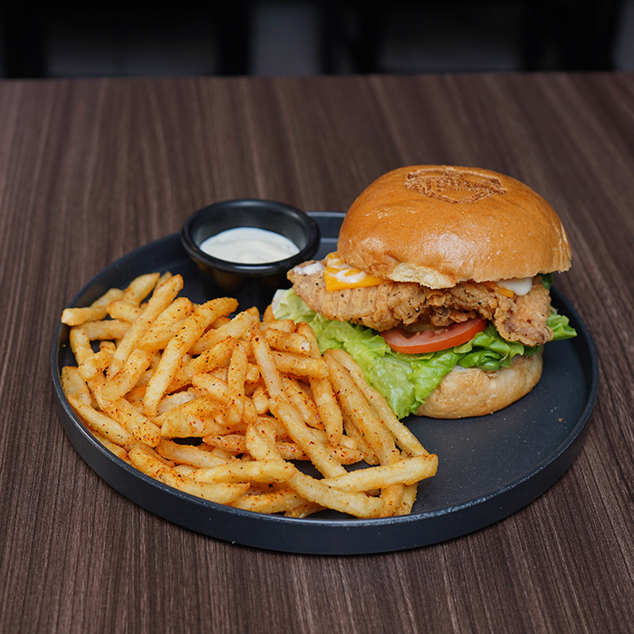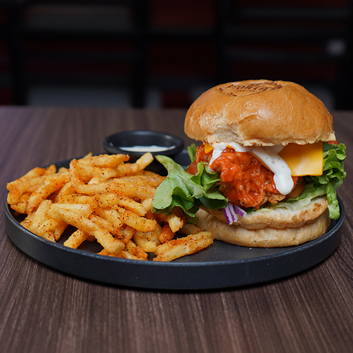 Pan brioche, medallón de pechuga de pollo empanizada, queso suizo, aderezo de la casa, lechuga romana, tomate, cebolla morada y aderezo buffalo ranch. (NO INCLUYE PAPAS)