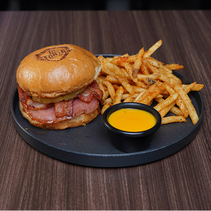Pan brioche, carne de res, queso americano, tocino, jamón, piña asada, aderezo de la casa, acompañada de queso líquido.