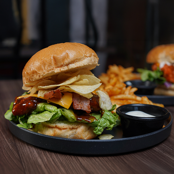 Pan brioche, pechuga de pollo empanizada bañada en salsa bbq, queso americano, lechuga, tocino, pepinillos y chips, acompañada de aderezo ranch.