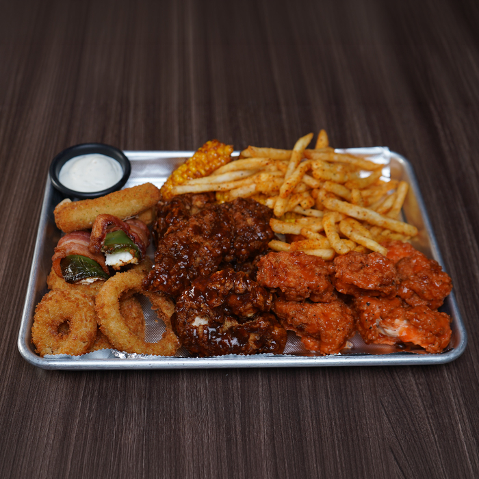 200gr de boneless, 200gr de tenders, 4 dedos de queso, 2 jalapeño poppers, 4 aros de cebolla, papas a la francesa, elotito dulce, crudites de zanahoria y apio, salsa y aderezos a elegir.