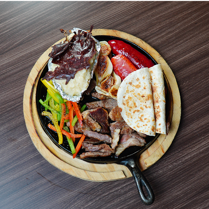 450gr de fajitas de res, acompañadas de cebolla asada, 2 salchicha asada, 4 quesadillas, chiles toreados, pimientos asados, papita horneada, tortillas y salsas.