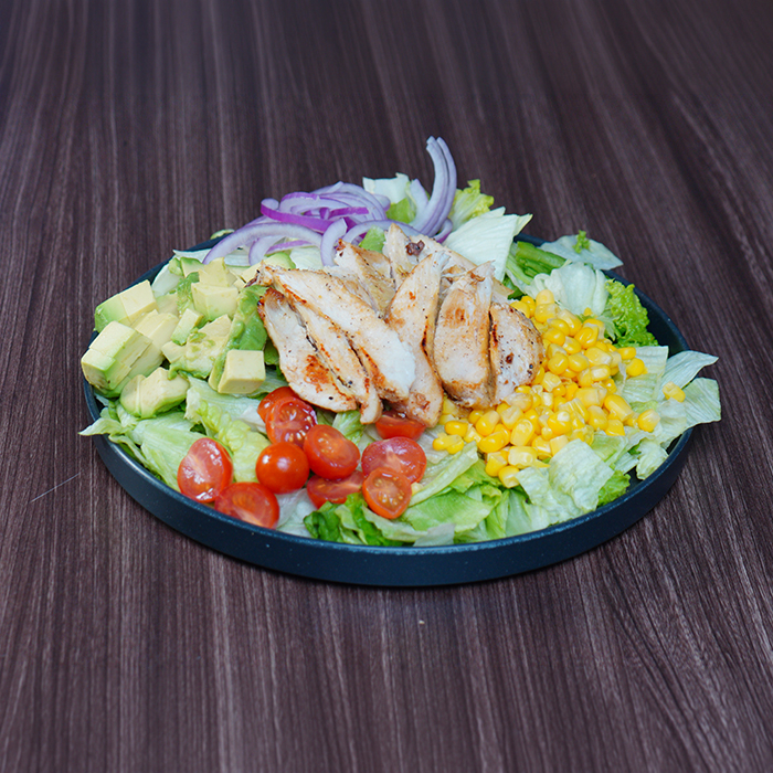 Lechuga en trozos, tomate Cherry, cebolla morada, elote amarillo desgranado, trozos de aguacate y pollo a la plancha, acompañado de aderezo ranch.