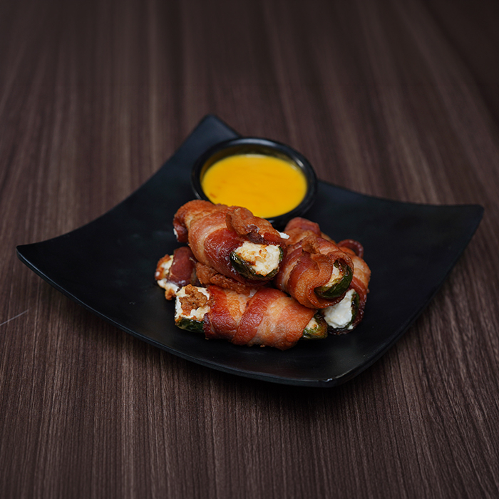 Chiles jalapeño rellenos de queso crema y envueltos en tocino (5).