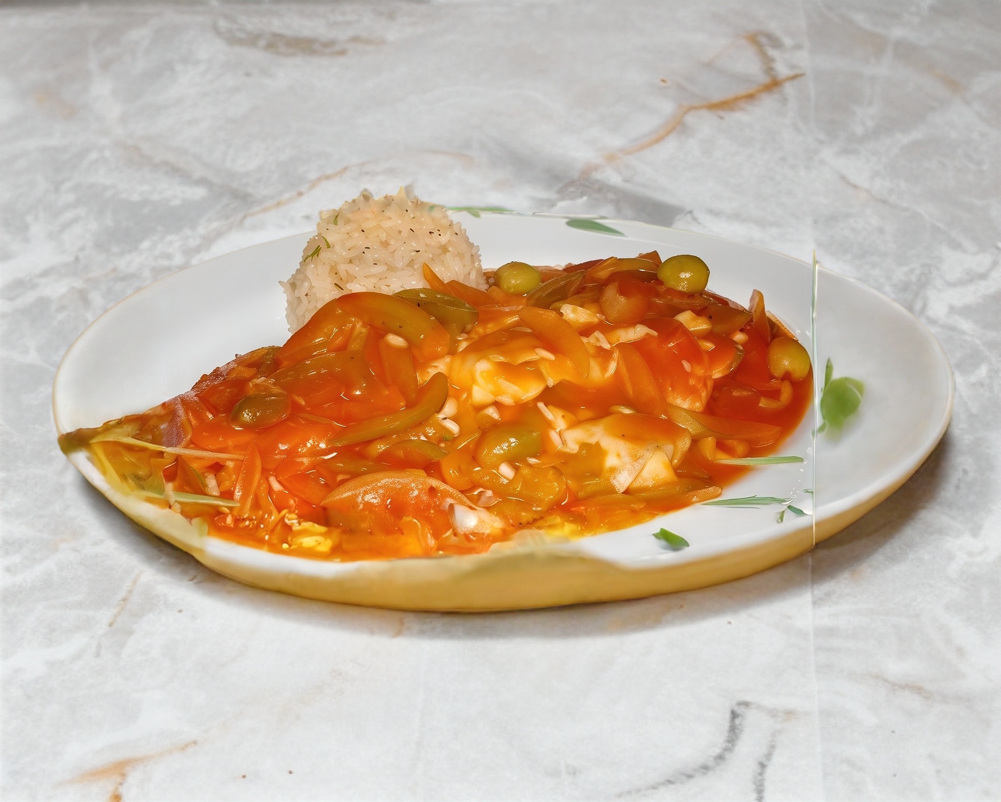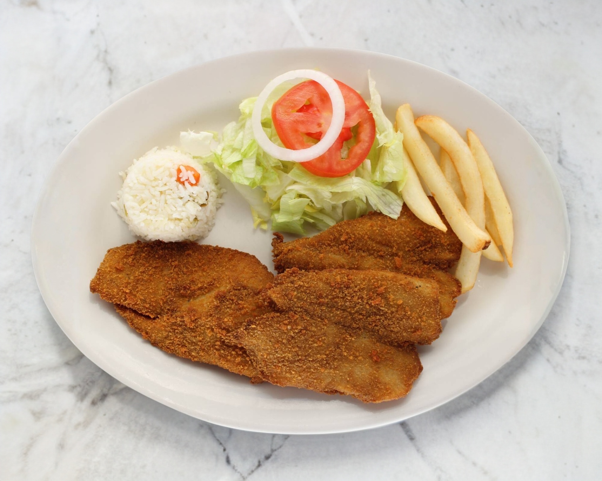 Dos porciones de filete empanizados rellenos de camarón, jaiba, surimi, tomate, cebolla, acompañados de arroz, papas y ensalada.