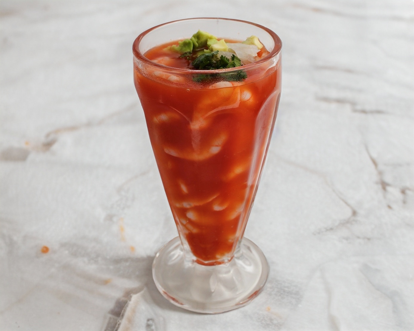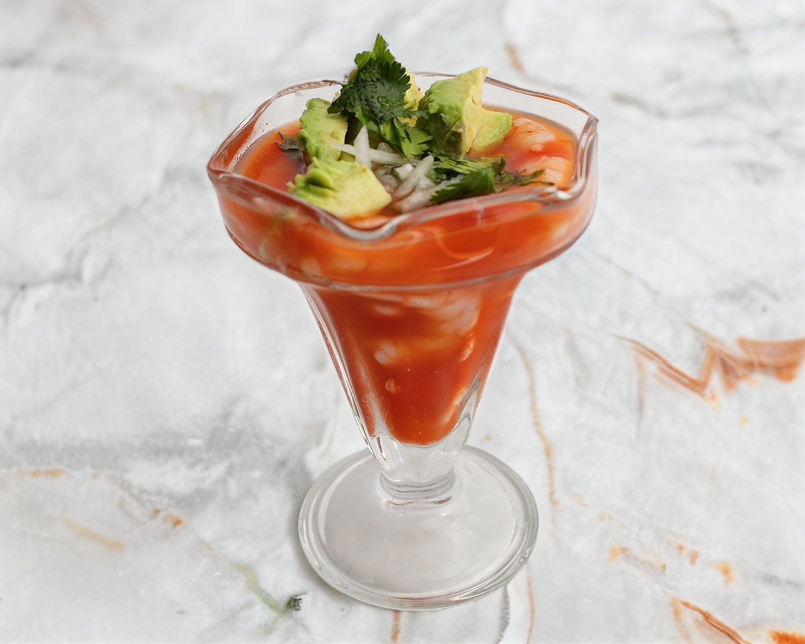 Platillo personal con 160 g de camarón preparado con catsup, cebolla, cilantro y aguacate, servido en vaso de 14 oz con todos los ingredientes incluidos.
