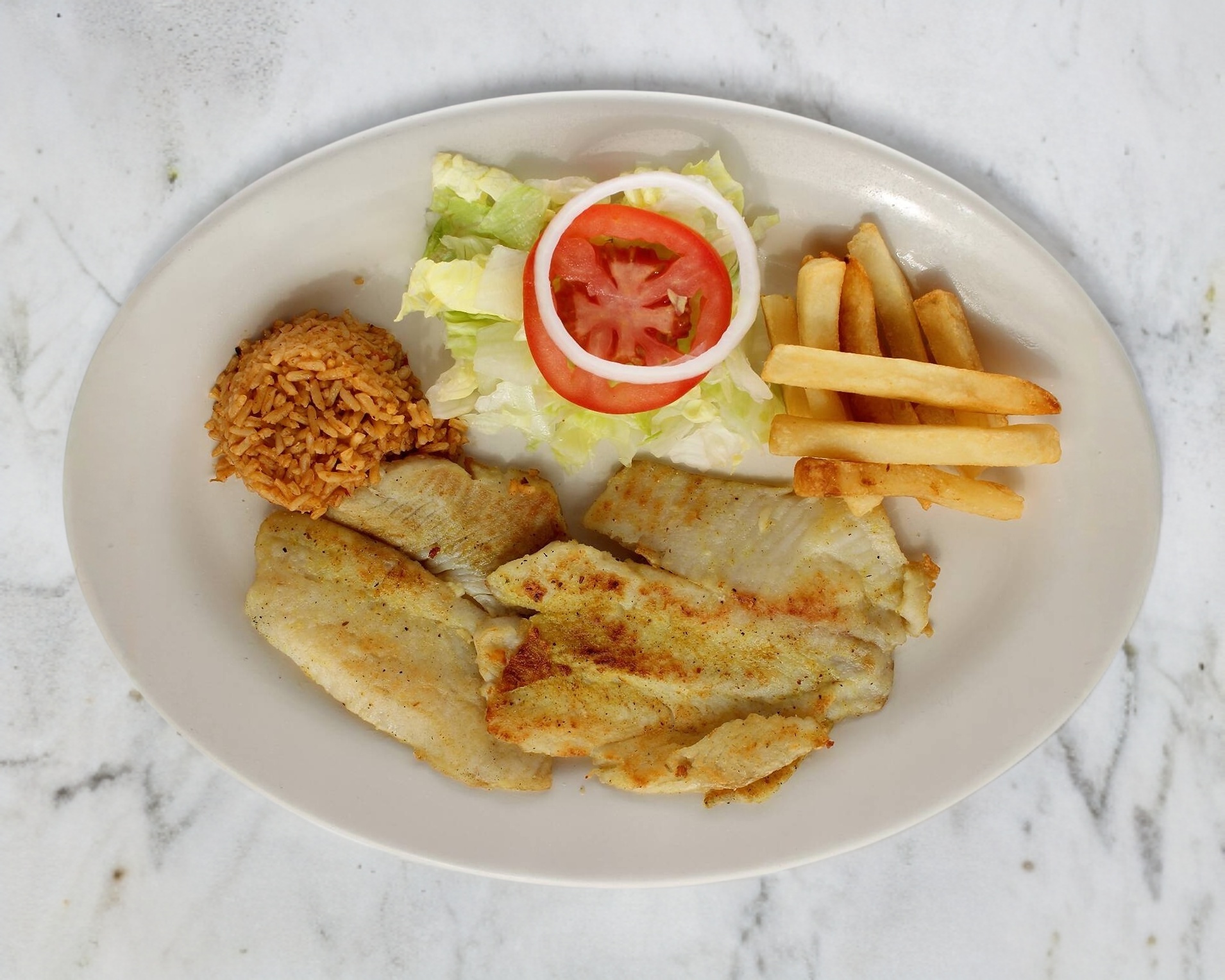 350 Gr de filete 180 gr de camarones empanizados 1/2 aguacate relleno con ensalada de atún 8 piezas de cebolla empanizadas 1 orden de papas a la francesa.
