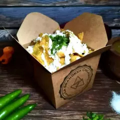 Totopos salseados en salsa a elegir, queso fresco, jamón, tocino, cebolla picada, cilantro y crema. Servidos en una caja para chilaquil. Nueva presentación más amigable con el medio ambiente.