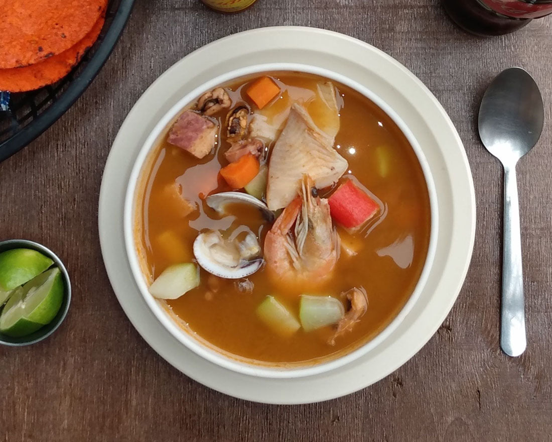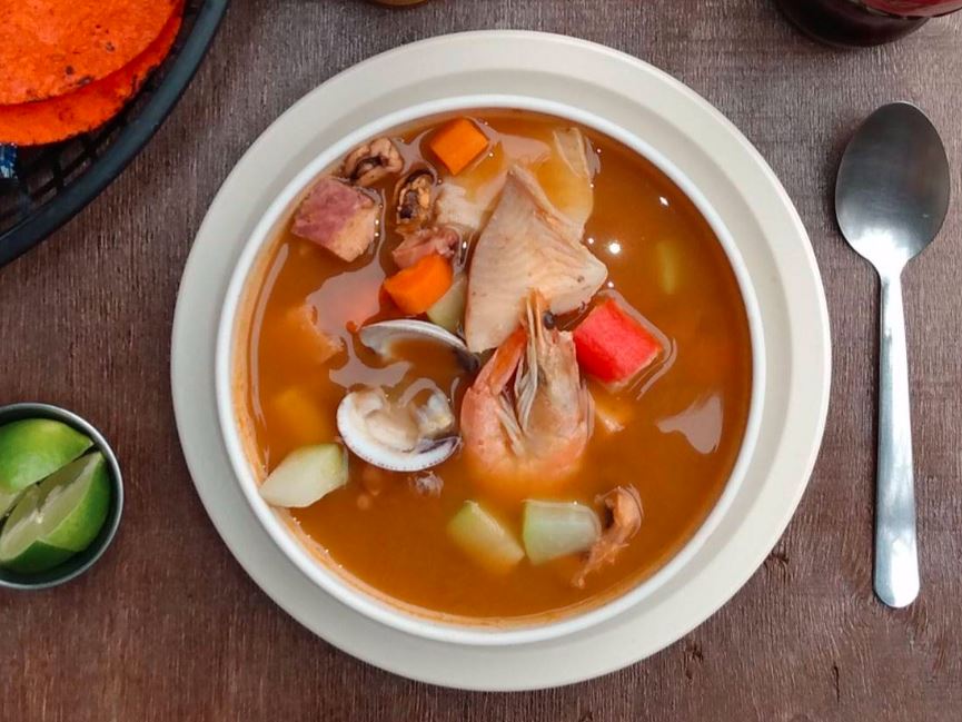 Caldo con tilapia, camarón pacotilla y macuil, lleva chayote, zanahoria e incluye porción individual de arroz, acompañado de tostadas y galleta.