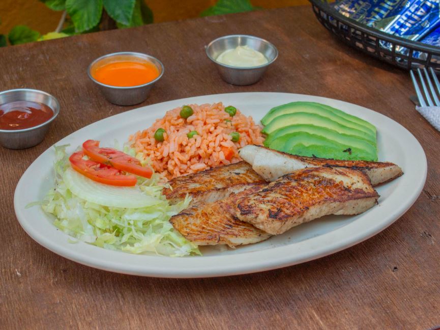 Porción de filete tilapia de 190 o 200 gr. a la plancha sazonado con salsa inglesa, sal, pimienta y un toque de limón, acompañado con arroz, lechuga y aguacate.