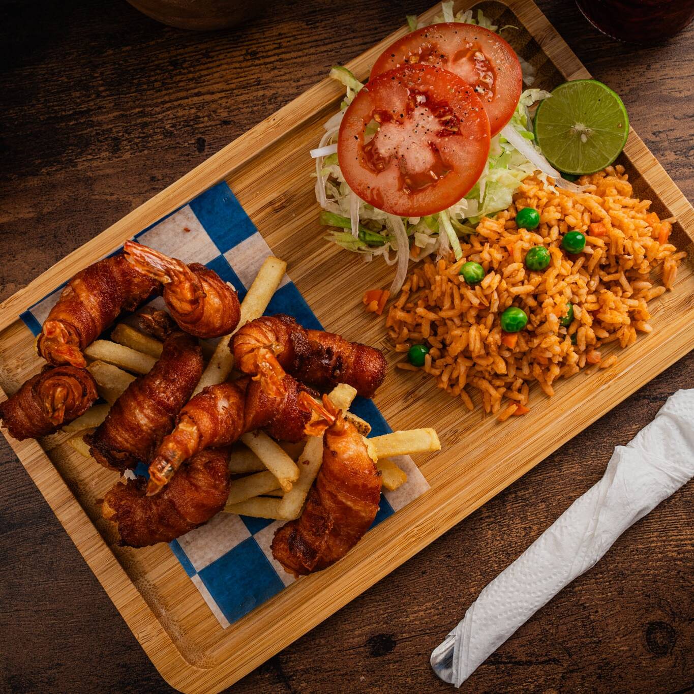 Cinco camarones rellenos de Queso Philadelphia, envueltos con tocino, acompañados con arroz, lechuga y papas, incluye consomé chico.