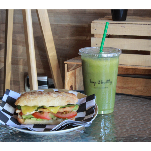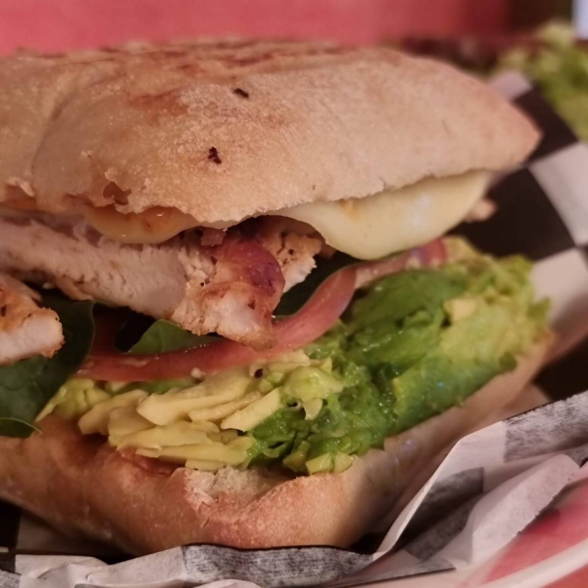 Pan con mayo chipotle de la casa, aguacate, queso manchego presidente, tomate, espinaca y pechuga de pollo