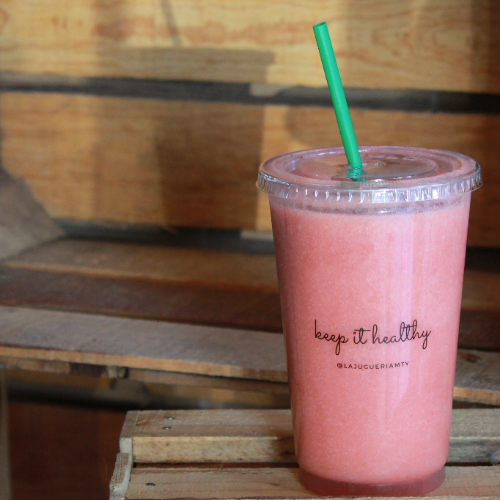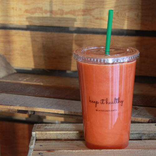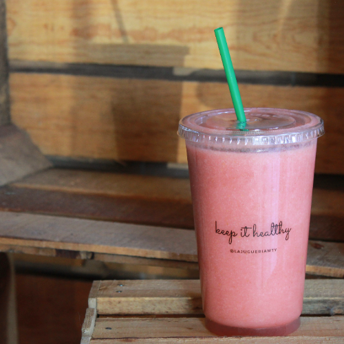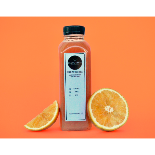 Jugo prensado en frio con naranja, fresa y kiwi.