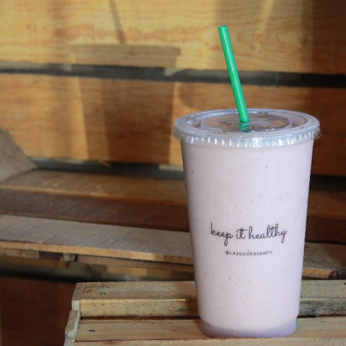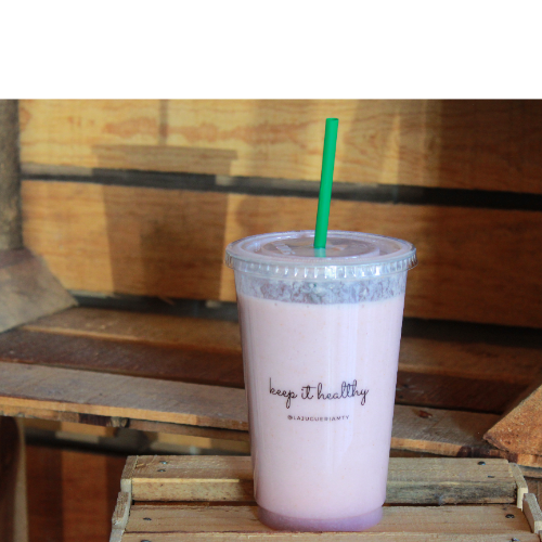 Platano, fresa, miel, leche de almendra, dátil, goji berries