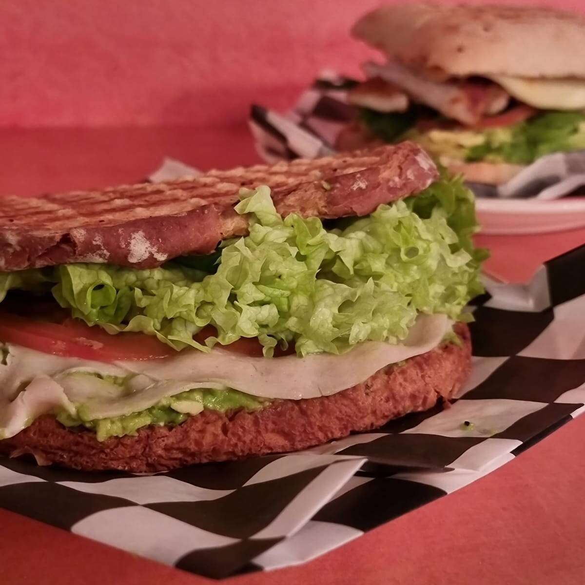 Pan 12 gramos, mayo, queso manchego, pechuga de pavo, aguacate, lechuga, espinaca, tomate.
