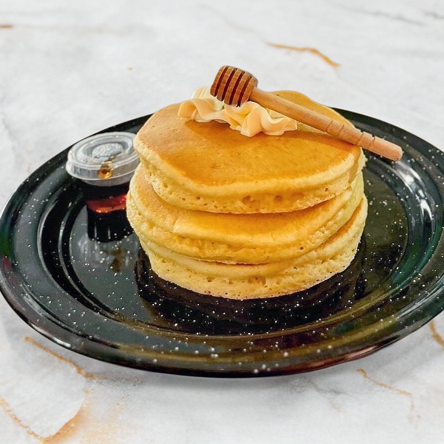 2 piezas de hot cakes, huevo estrellado y salchicha.