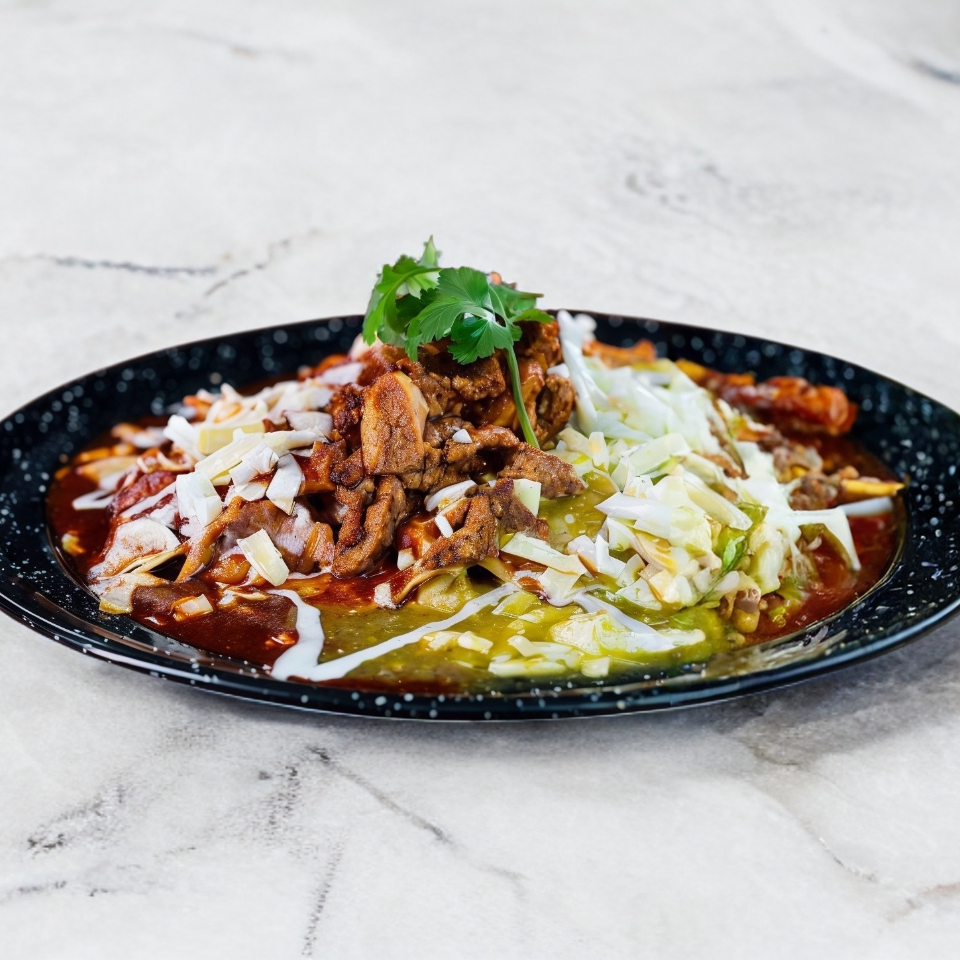 Nuestras tradicionales salsas verde y roja, mezcla de 2 quesos, crema ácida y pico de gallo. Agrega un guiso a elegir o frijoles (Nuestras salsas se envían por separado)