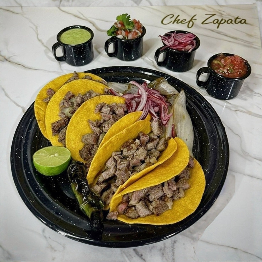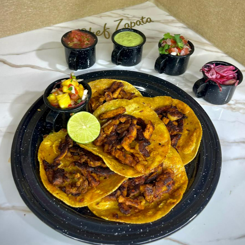Carne asada, pastor, costra de queso, frijoles refritos, lechuga y pico de gallo.