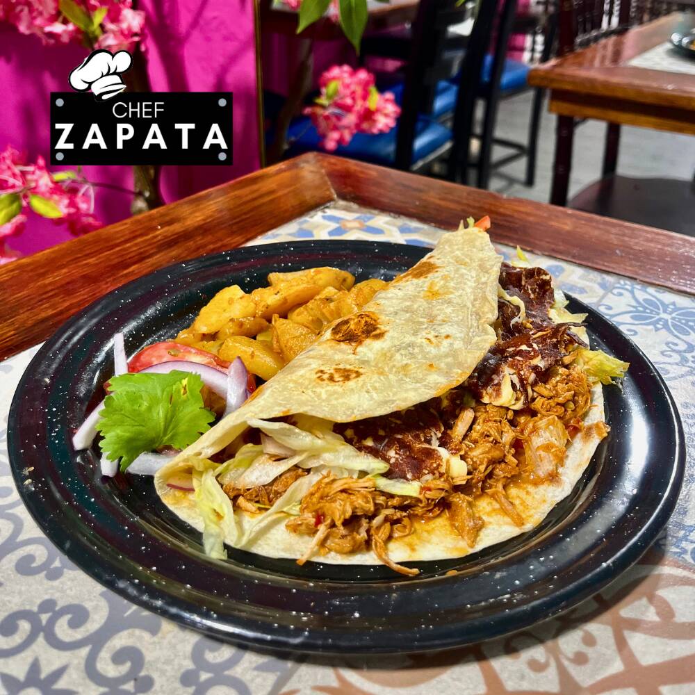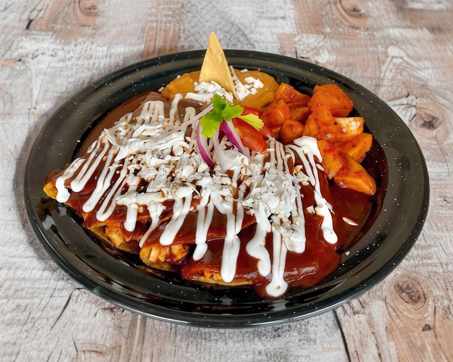 En Salsa Verde o Roja, Frijoles Refritos, Pollo a la plancha, Mezcla de 2 Quesos, Crema ácida y Pico de gallo. (Nuestras salsas se envían por separado)