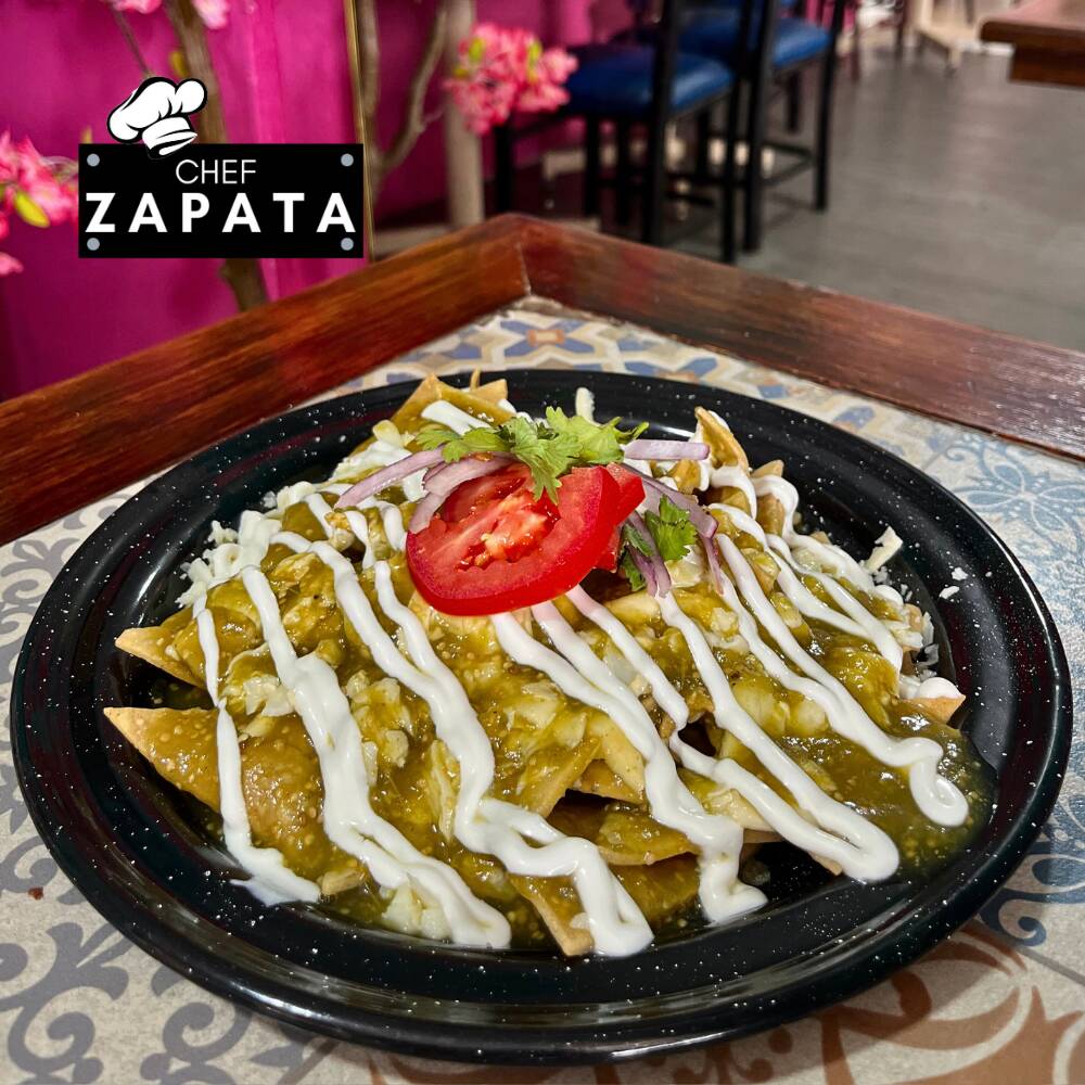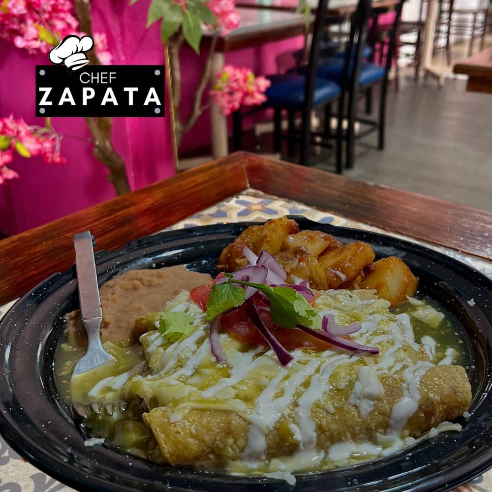 Enchiladas verdes rellenas de pollo, con queso y crema. Acompañadas de Papas al chipotle y frijoles refritos