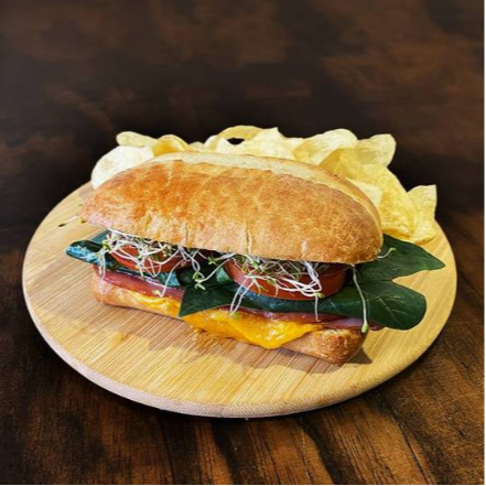 Ciabatta con jamón de pavo ahumado, queso cheddar, germinado de alfalfa, tomate, espinacas, mayonesa y mostaza Dijon con side de papas fritas.