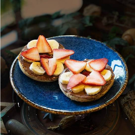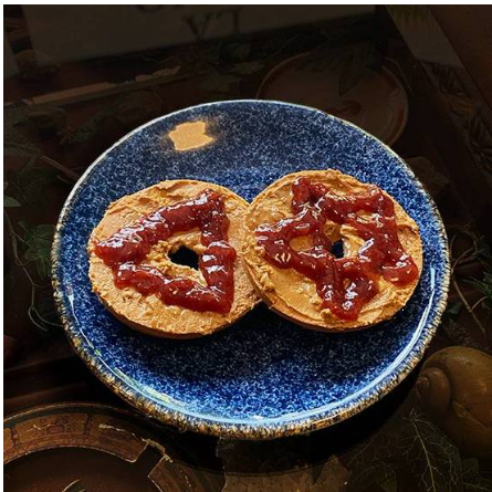 Bagel tostadito con mantequilla, peanut butter y mermelada de fresa.