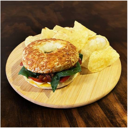 Bagel parmesano con queso mozzarella, pepperoni, espinacas y tomate deshidratado con un toque de aceite de oliva y side de papas fritas.