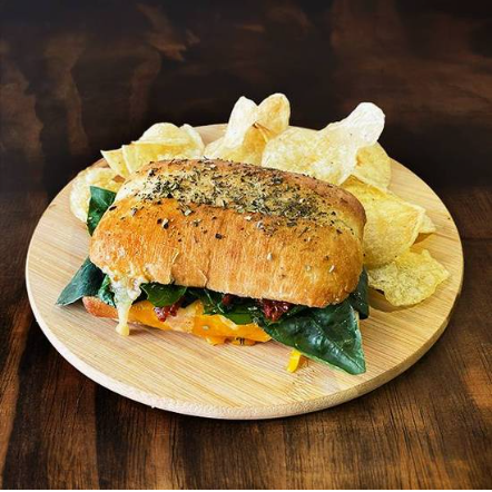 Ciabatta hierbas finas con queso gouda, queso mozzarella, queso cheddar, espinacas y tomate deshidratado con side de papas fritas.