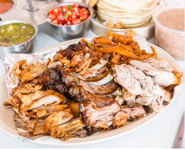 750 grs de carnitas a elegir surtido o maciza, 3 tipos de salsa, cebolla, cilantro, limones