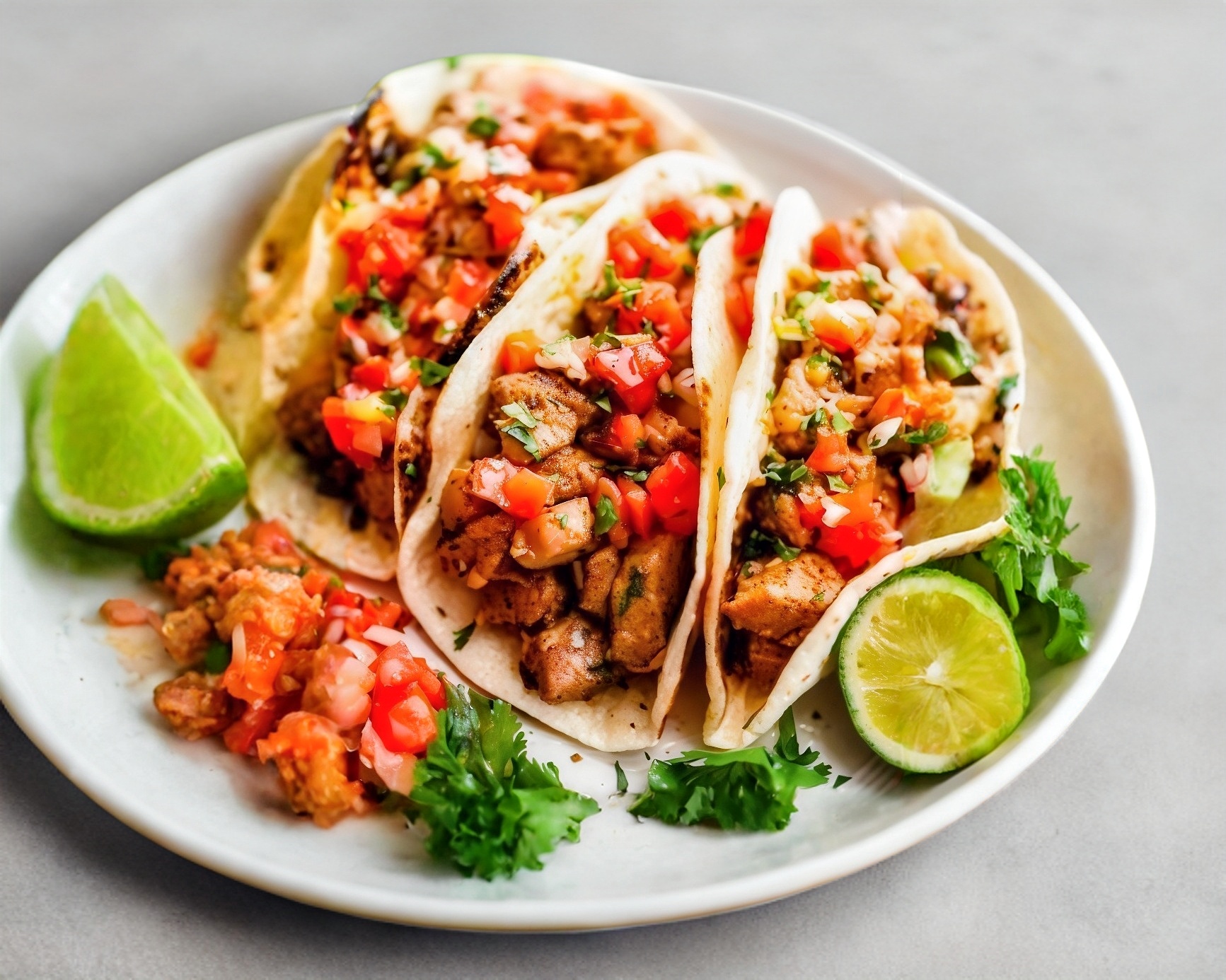 5 Tacos de carnitas Doble tortilla servidos con salsas, limónes y complementos