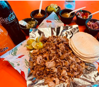 1 kg De carnitas, 1 kg de tortillas de maíz, 1 refresco coca cola de 1.75 Litros. Incluye salsa, roja, verde, xnipec, limones, cilantro y cebolla.