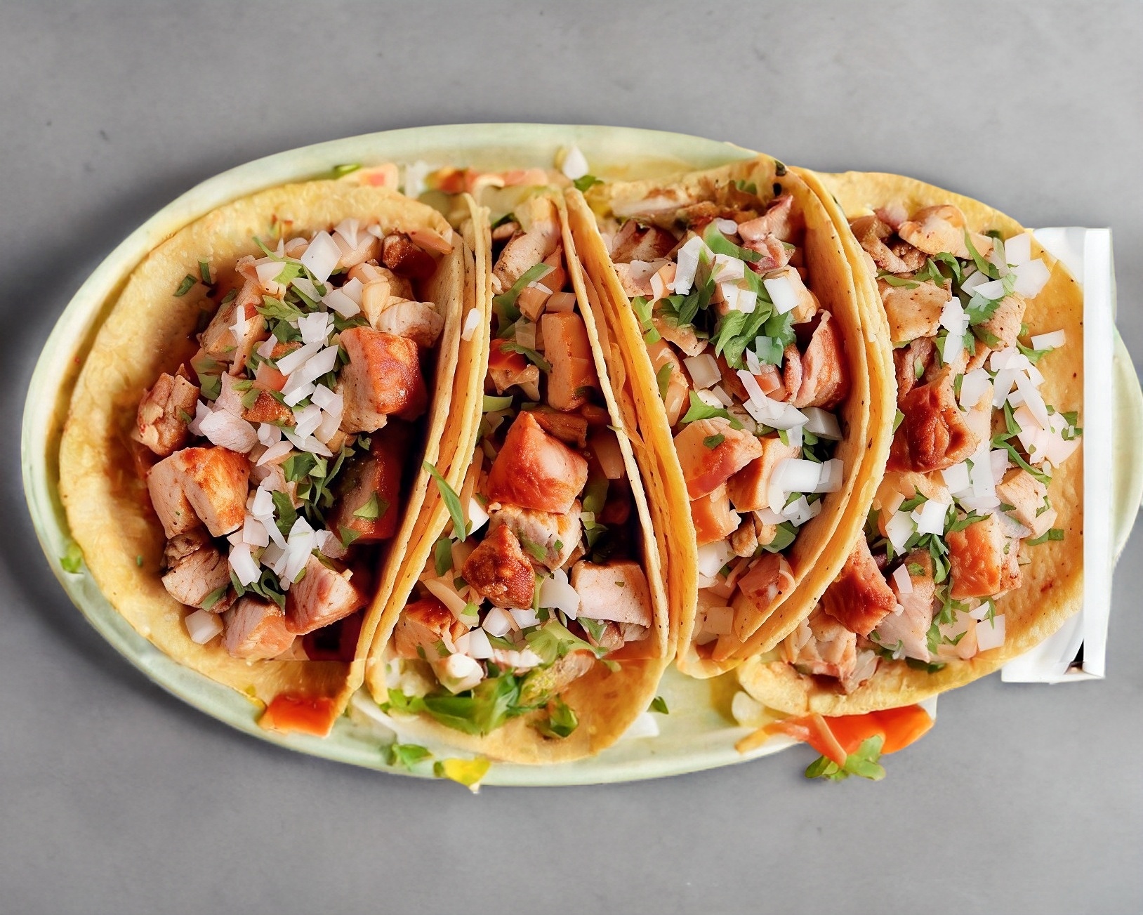 Maciza adobada, tortilla de maíz, salsas, cebolla con cilantro, limón.