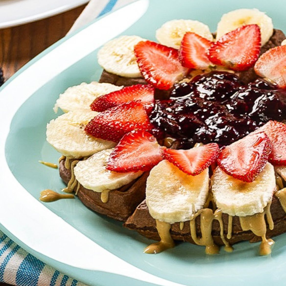 Deliciosos waffles fit sin harina; con avena, cocoa, claras de huevo y leche de coco. Servido con crema de maní 100% casera, plátano y merme. de frutos rojos