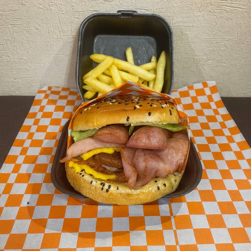 Hamburguesa con doble carne de arrachera jugosa, tocino crujiente, salchicha para asar, queso manchego y queso americano fundido. Incluye papas fritas doraditas. Un combo poderoso y lleno de sabor.