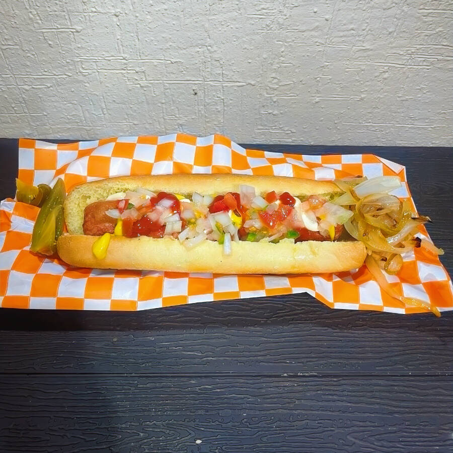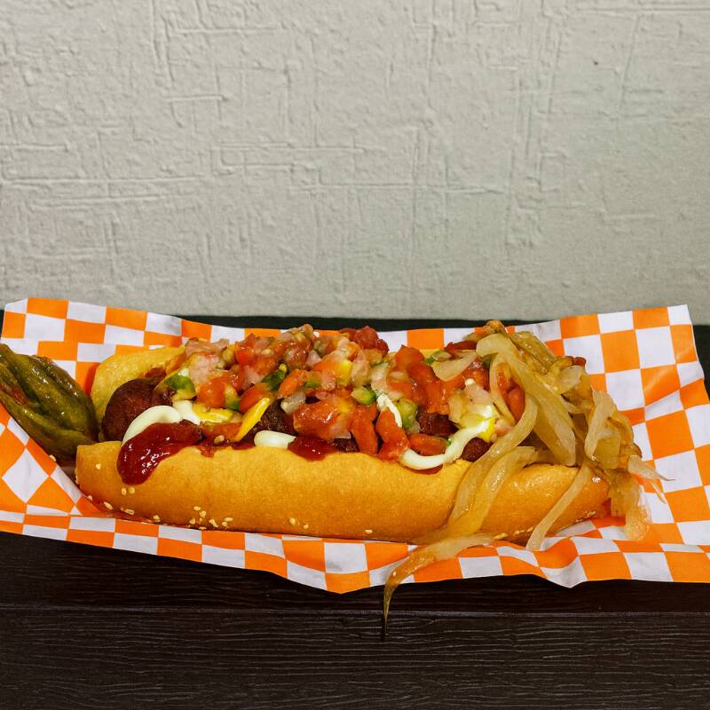 🌭🔥 Hotdog de 19 cm con chile, tomate y cebolla caramelizada + 🍟 papas fritas. ¡Grande, sabroso y super llenador!