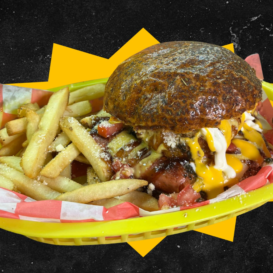 PAN ARTESANAL, CARNE DE SIRLOIN, QUESO SUIZO, QUESO CHEDAR, CEBOLLA MORADA, TOMATE, GUACAMOLE Y ADEREZO DE LA CASA ACOMPADANA DE PAPAS
