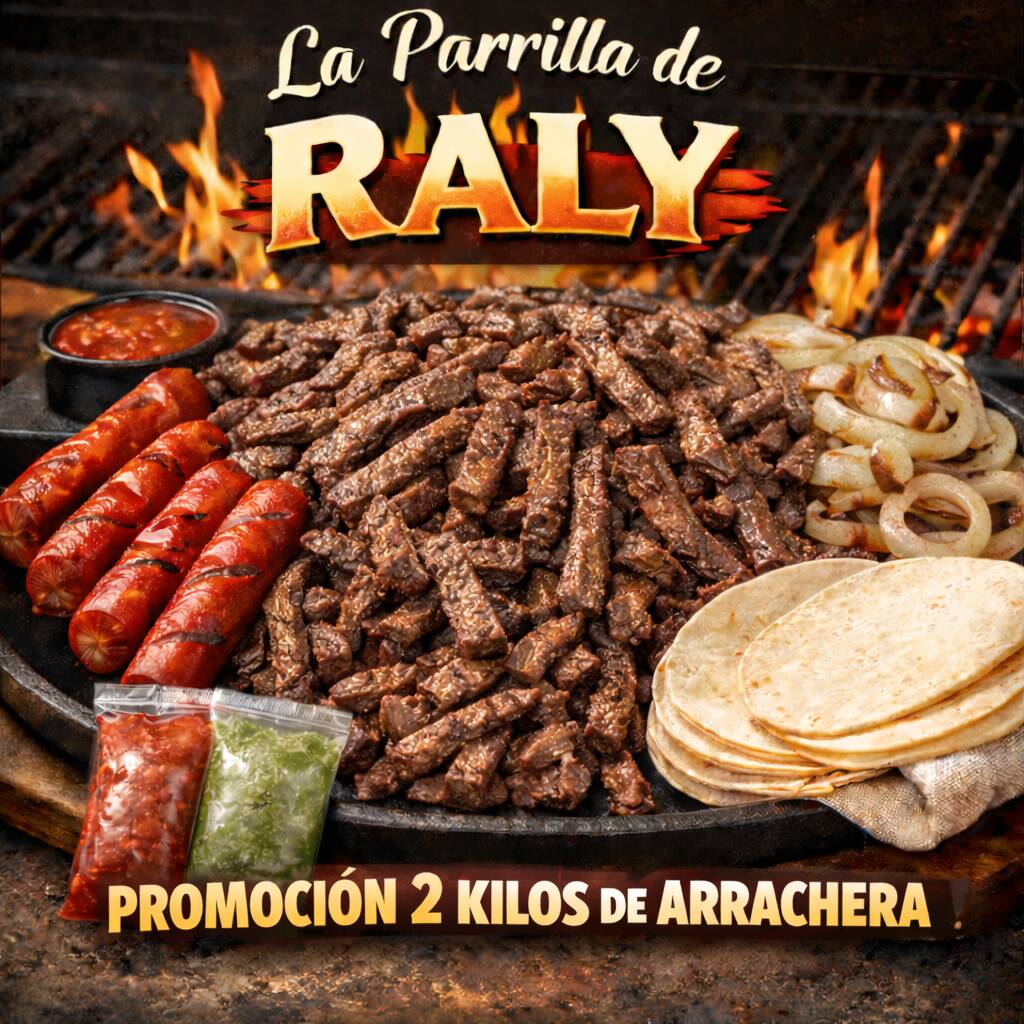 2 kg de arrachera asada -incluye: salchichas, salsa (roja y verde) tortillas y rica cebolla asada