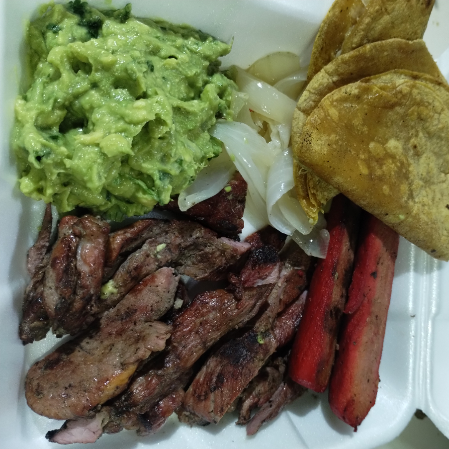 TIRAS DE CARNE ASADA INCLUYE UNA SALCHICHA, QUESADILLAS EN HARINA O MAÍZ, GUACAMOLE Y FRIJOLES CHARROS