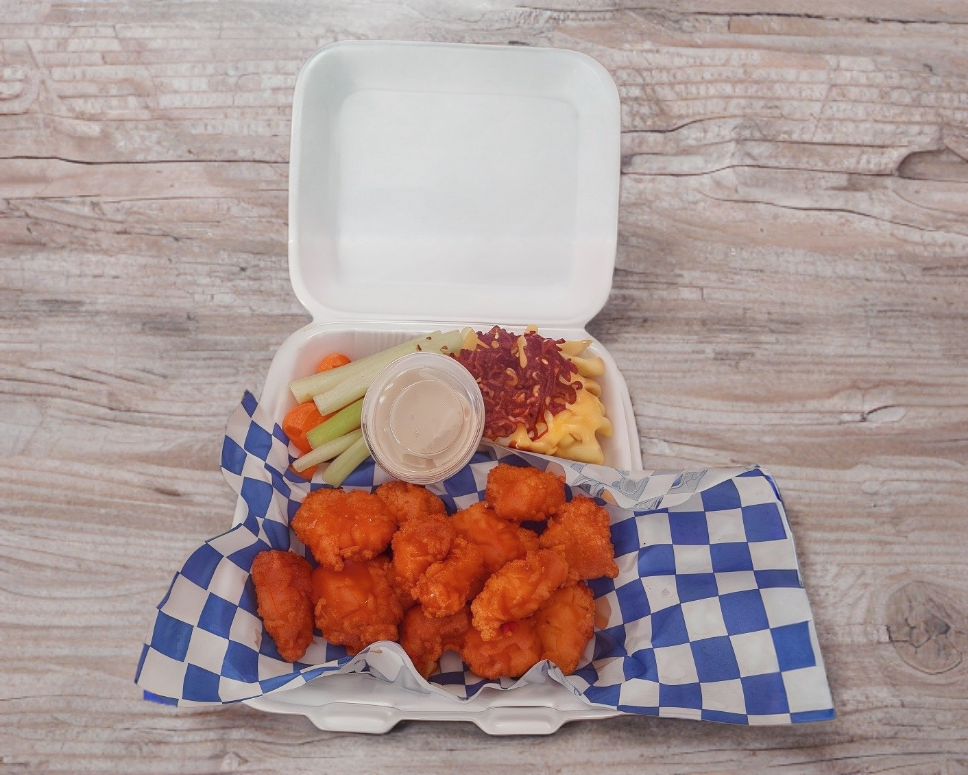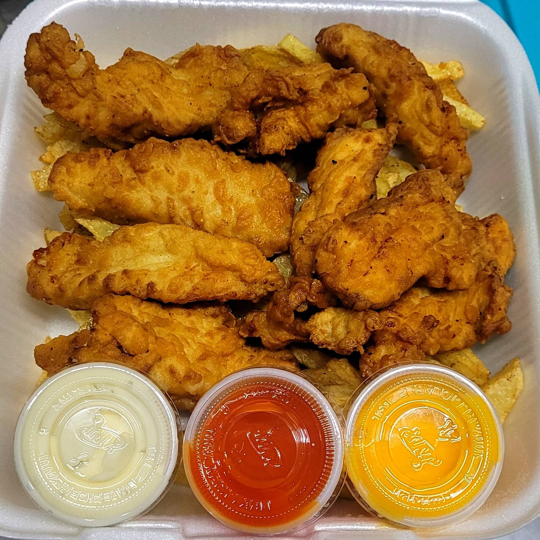 8 pzas de tenders con salsa a elegir, acompañadas de papas a la francesa y verduras.