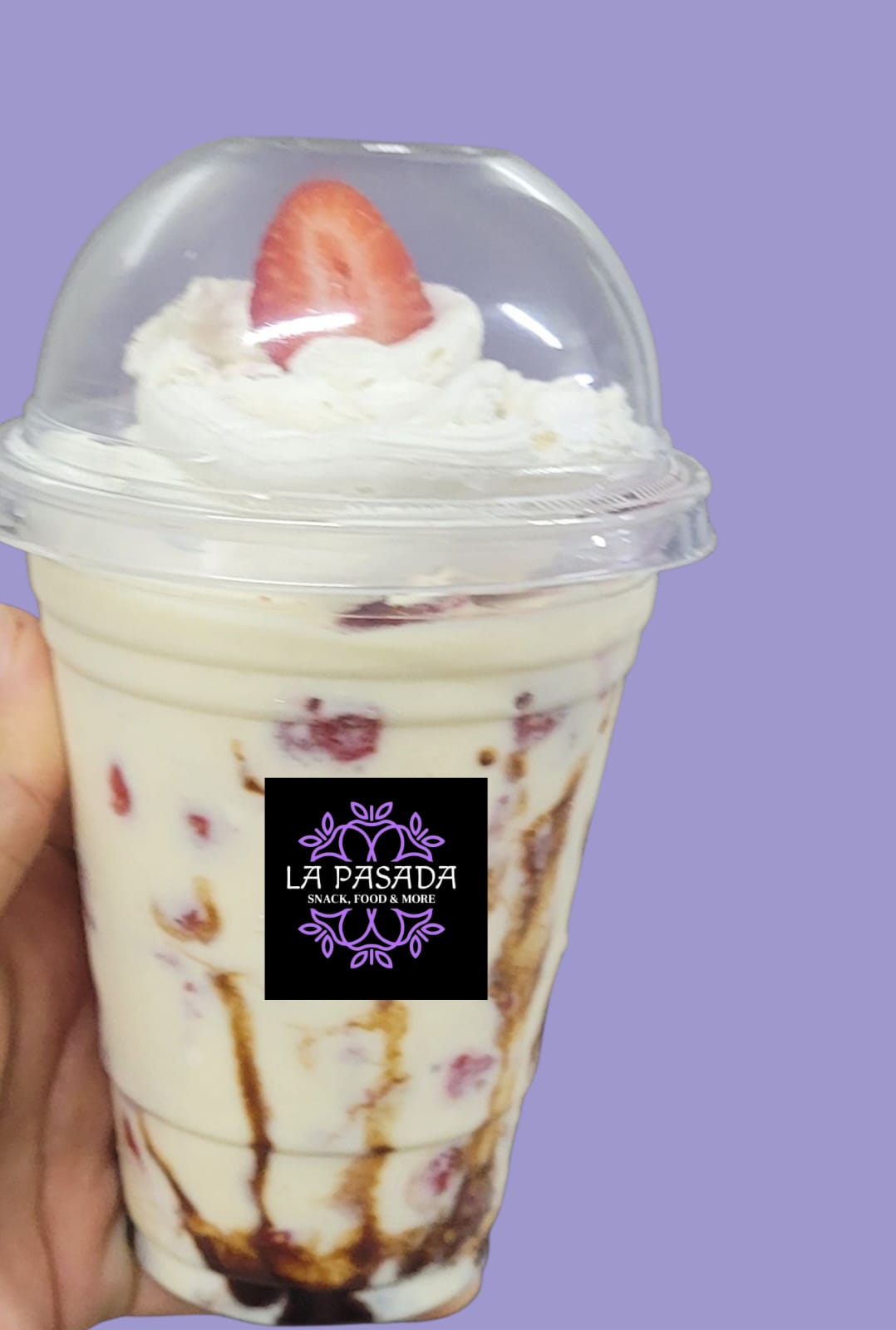 Deliciosas fresas con crema vaso de 14 oz con topping a elegir.