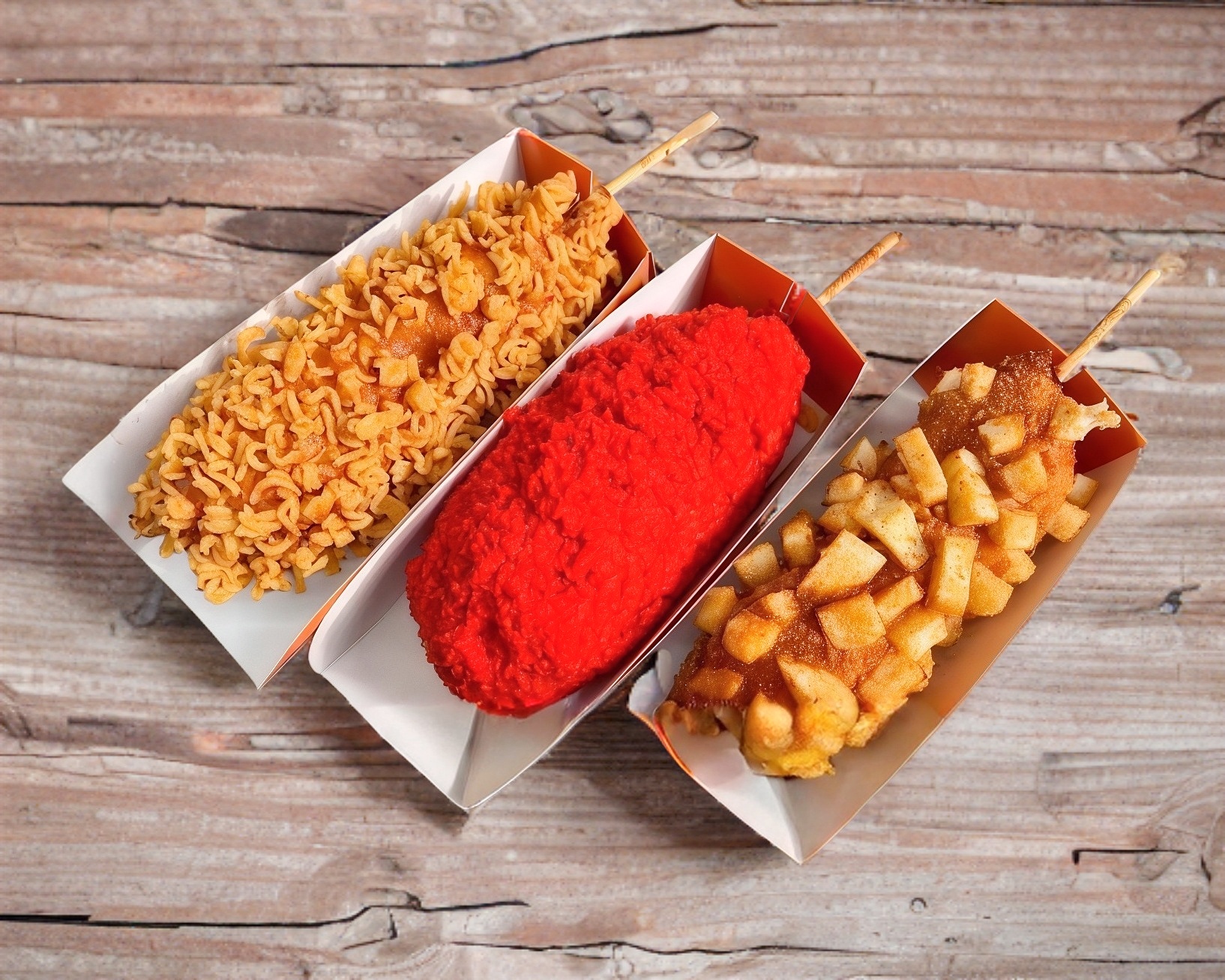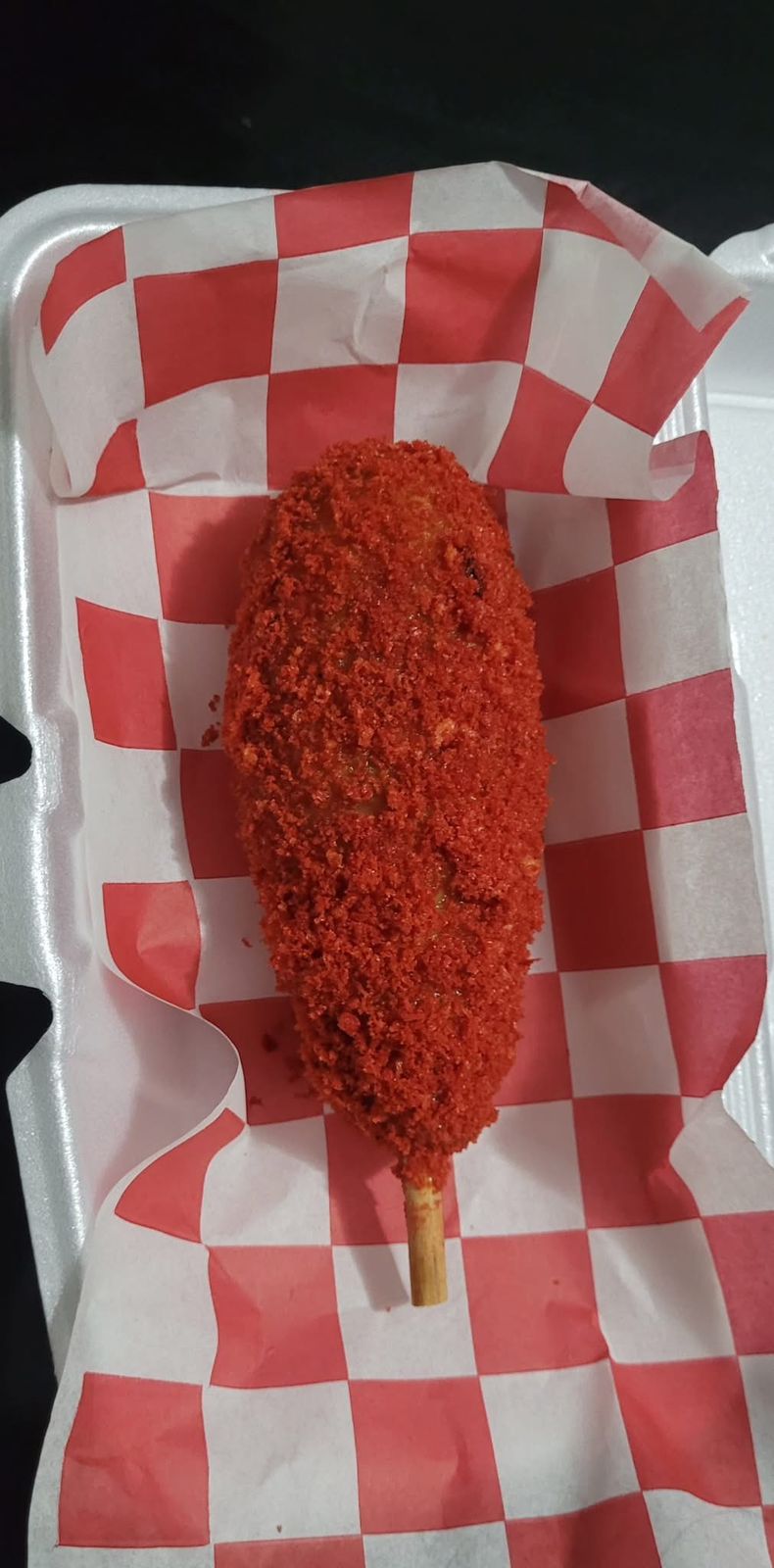 Banderilla rellena de salchicha cubierta de chetos flamin hot, ruffles, ramen, papas o panko.