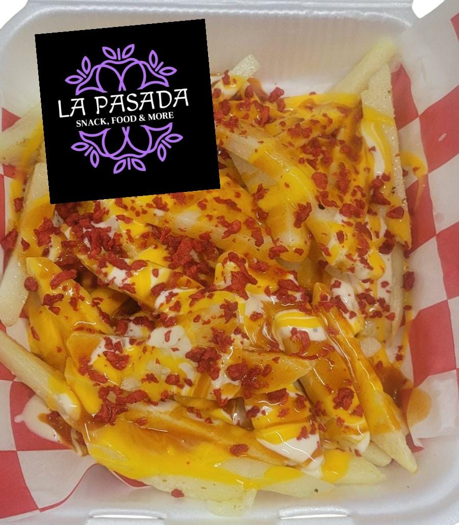 Papas a la francesa, queso amarillo, ranch, salsa búfalo y tocino deshidratado.