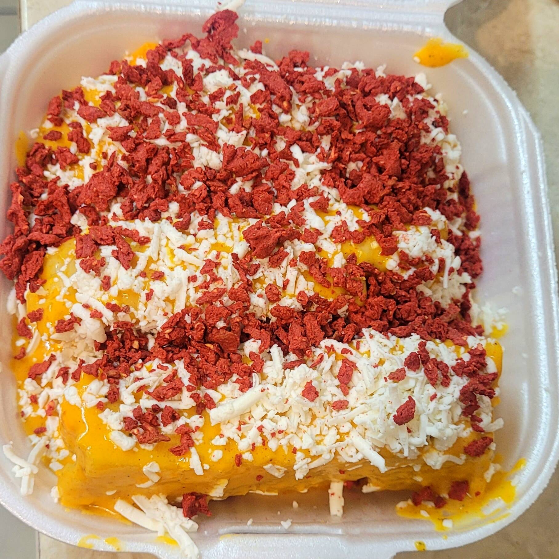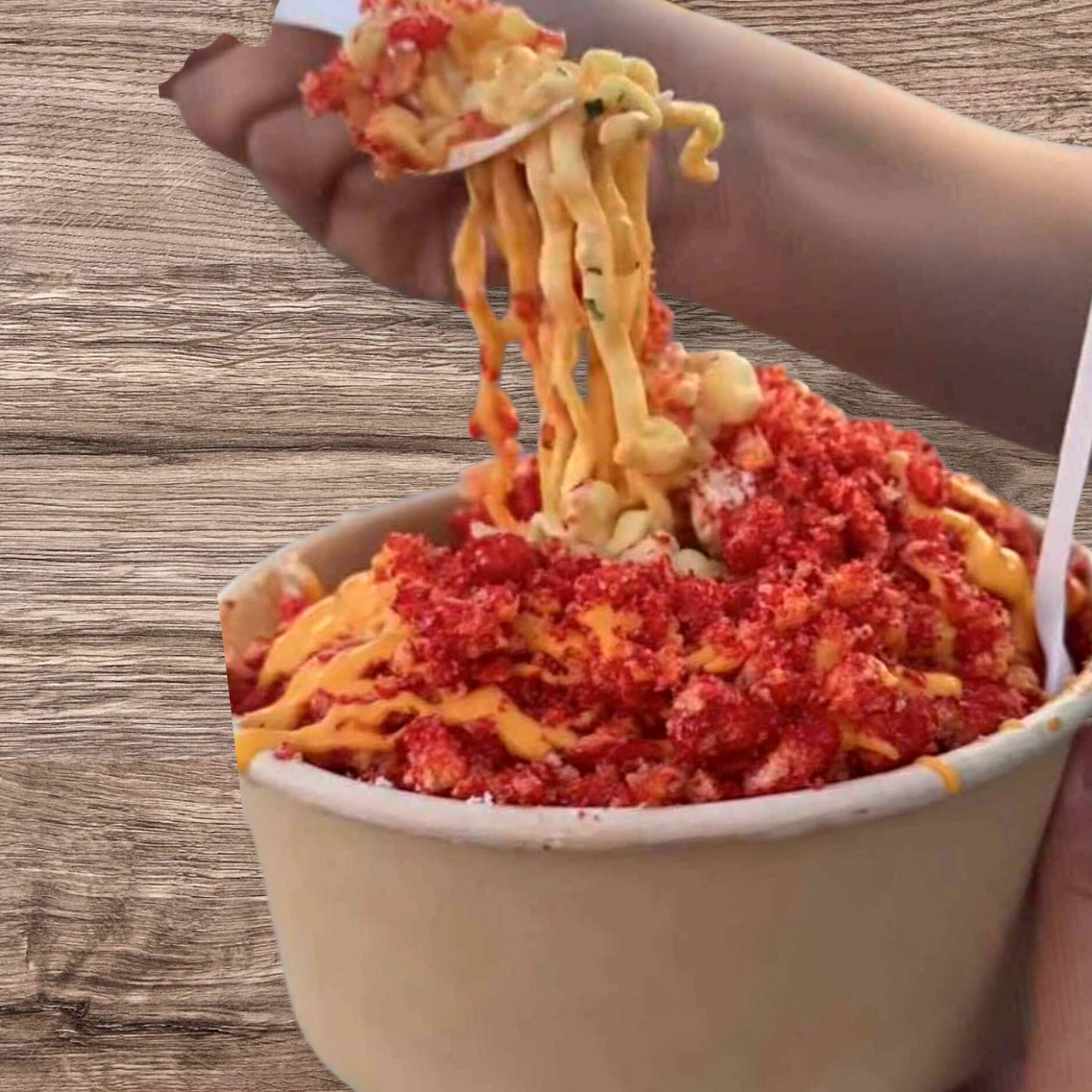 Banderilla rellena de queso cubierta de chetos flamin hot, ruffles, ramen, papas o panko.