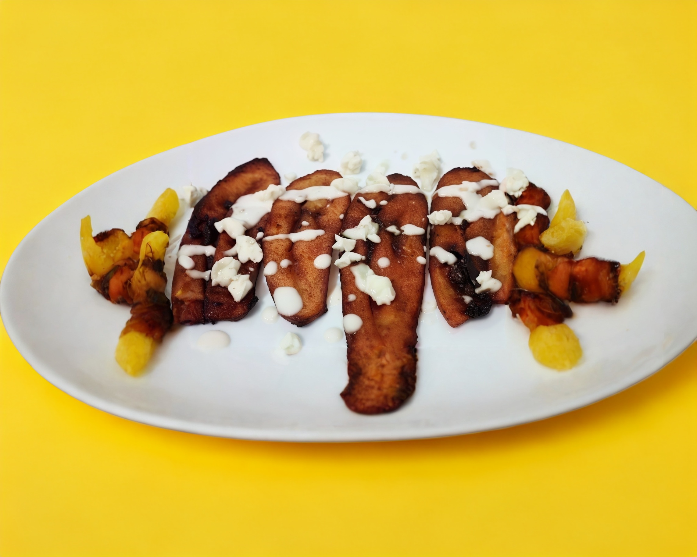 Plátano macho frito, bañado con lechera o crema y queso. Porción personal..