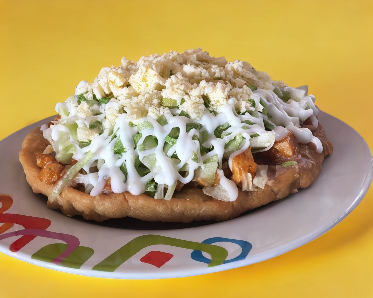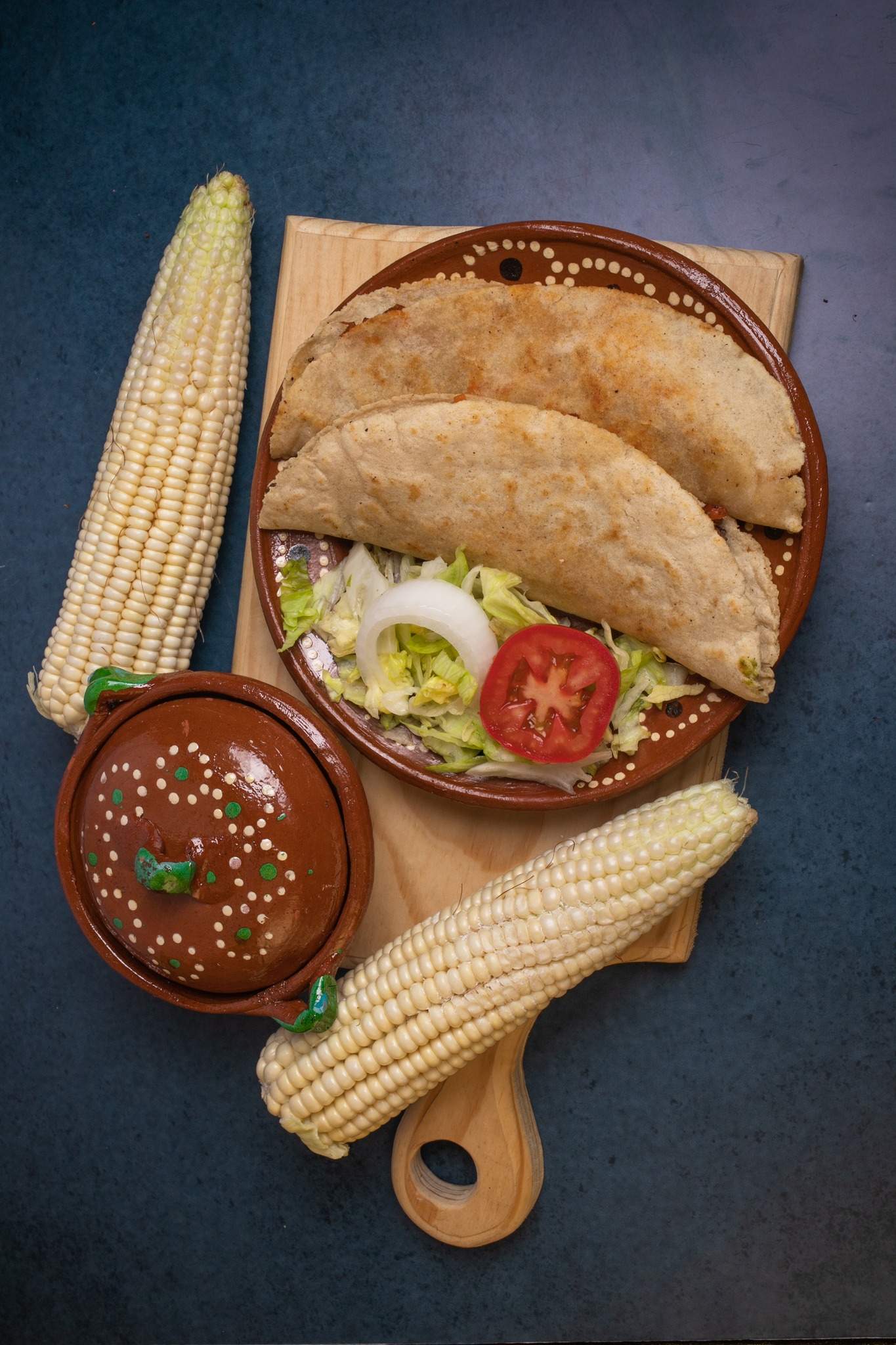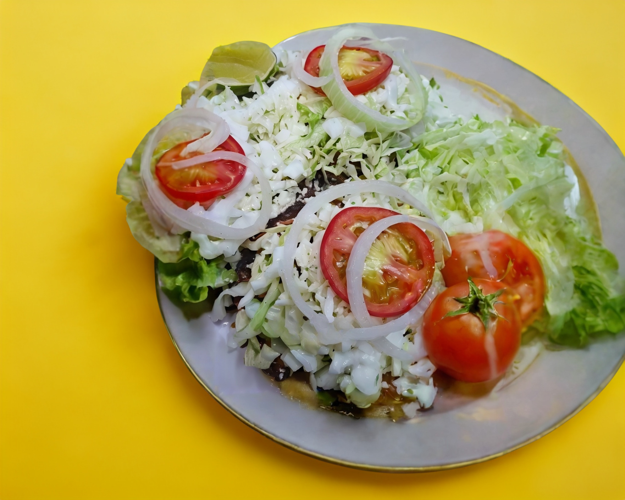 Tortilla de maíz gruesa con borde picado, frijol y queso en la base, el guiso de tu elección, acompañado de ensalada y crema.